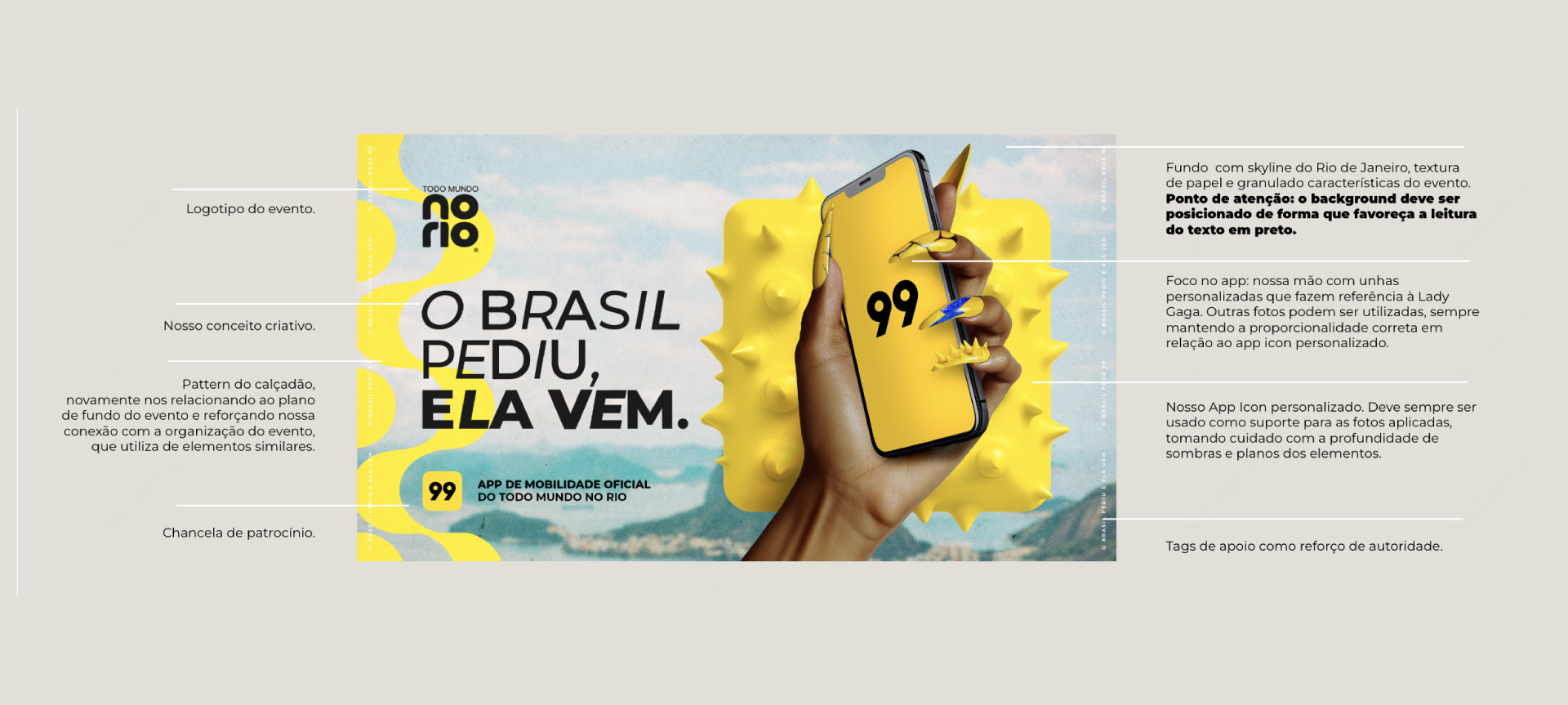 Fui responsável por toda a visão e direção criativa da 99 no projeto. Atuei liderando a concepção e a execução do universo visual, direcionando equipes de design, redação e as células da Eyxo responsáveis pelos desdobramentos (social e studio) para garantir consistência de marca, alinhamento entre squads e, ao mesmo tempo, espaço para autonomia criativa nos desdobramentos. Meu papel foi assegurar que cada peça traduzisse tanto a força da masterbrand 99 quanto a intensidade cultural de um evento histórico, respeitando as restrições de imagem da artista e mantendo os aprendizados estratégicos da marca: consistência, grandeza, autoestima, percepção de qualidade e brasilidade.